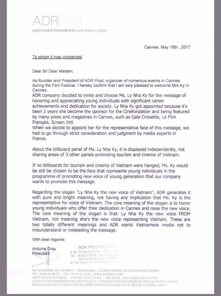 | Gửi người/đơn vị có liên quan xử lý công việc trong thư Kính gửi Ông / Bà Là người sáng lập cũng như Chủ tịch Công ty ADR Prod, công ty tổ chức các sự kiện tại Cannes trong suốt Liên hoan phim, tôi rất vinh dự được đón tiếp Ms. Ky tại Cannes. Công ty ADR đã quyết định mời và chọn Ms. Ly Nha Ky cho thông điệp tôn vinh và ủng hộ những cá nhân trẻ với thành quả sự nghiệp đáng kể và cống hiến cho xã hội. Ly Nha Ky được bầu chọn bởi vì cô ấy đã 2 năm bảo trợ cho Cinefdonation, và được nhiều báo chí truyền thông ở Cannes đưa tin, như là Gala Croisette, Le Film Francais, Screen Intl. Khi chúng tôi quyết định chọn Ms. Ky là gương mặt đại diện cho thông điệp này, chúng tôi đã cân nhắc và chọn lựa rất kỹ thông qua nhiều người cố vấn có kinh nghiệm truyền thông tại Pháp. Về bảng hiệu của Ms. Ly Nha Ky, nó được trưng bày độc lập hoàn toàn, không nằm chung diện tích của 3 bảng hiệu còn lại quảng bá du lịch và điện ảnh của Việt Nam. Nếu không có bảng hiệu quảng bá du lịch và điện ảnh Việt Nam, thì Ms. Ky vẫn sẽ được chọn là gương mặt đại diện những cá nhân trẻ nằm trong chương trình quảng bá những tiếng nói mới của thế hệ trẻ mà công ty chúng tôi đang muốn làm quảng bá thông điệp này. Về câu khẩu hiệu “Ly Nha Ky tiếng nói mới của Việt Nam”, ADR tạo ra nó với ý nghĩa trong sáng và minh bạch, không có ngụ ý nói rằng Ms. Ky là đại diện cho tiếng nói của Việt Nam. Ý nghĩa cốt yếu của khẩu hiệu là để tôn vinh các cá nhân trẻ có cống hiến tại Cannes và có tiếng nói mới. Ý nghĩa cốt yếu của khẩu hiệu là: Ly Nha Ky tiếng nói mới đến từ Việt Nam, không có nghĩa cô ấy là tiếng nói mới đại diện cho Việt Nam. 2 ý nghĩa này hoàn toàn khác nhau, và ADR mong truyền thông Việt Nam đừng hiểu nhầm hoặc làm sai lệch thông điệp. |