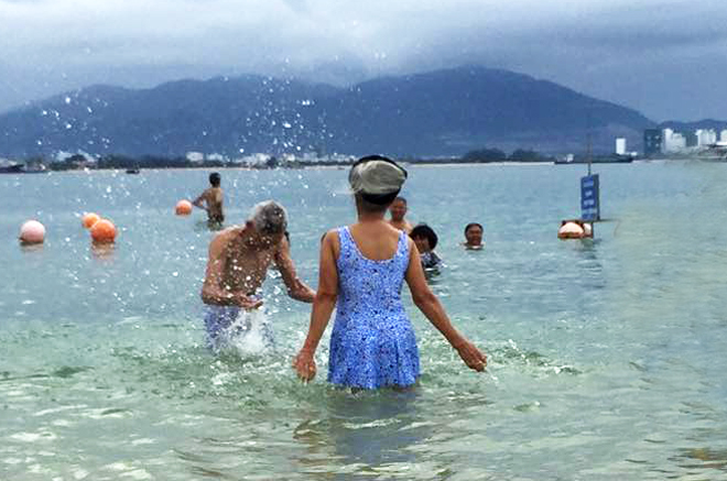 Tại bãi biển Nha Trang, cụ Hảo không có đồ bơi nên một người con đã mua tạm bộ đồ cho cụ bà.