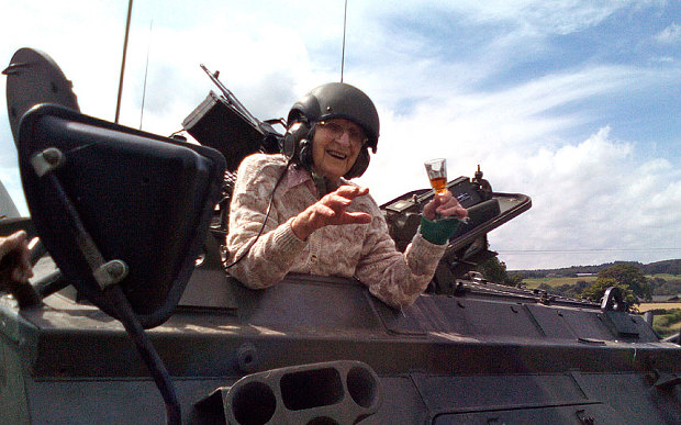 Theo tin tức từ Telegraph, một cụ bà sôi nổi, bị mù một bên mắt đã kỷ niệm sinh nhật lần thứ 101 của mình bằng việc lái xe tăng.