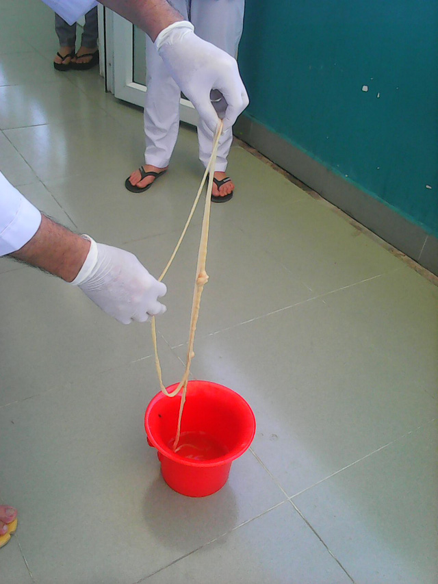 Qua khám và xét nghiệm phân, bà H. được cho uống thuốc xổ. Đến trưa ngày 7/4, bà H. đã đại tiện ra một con sán xơ mít dài hơn 5 mét. Đầu sán xơ mít đã được cắt bỏ để đưa đi làm xét nghiệm.