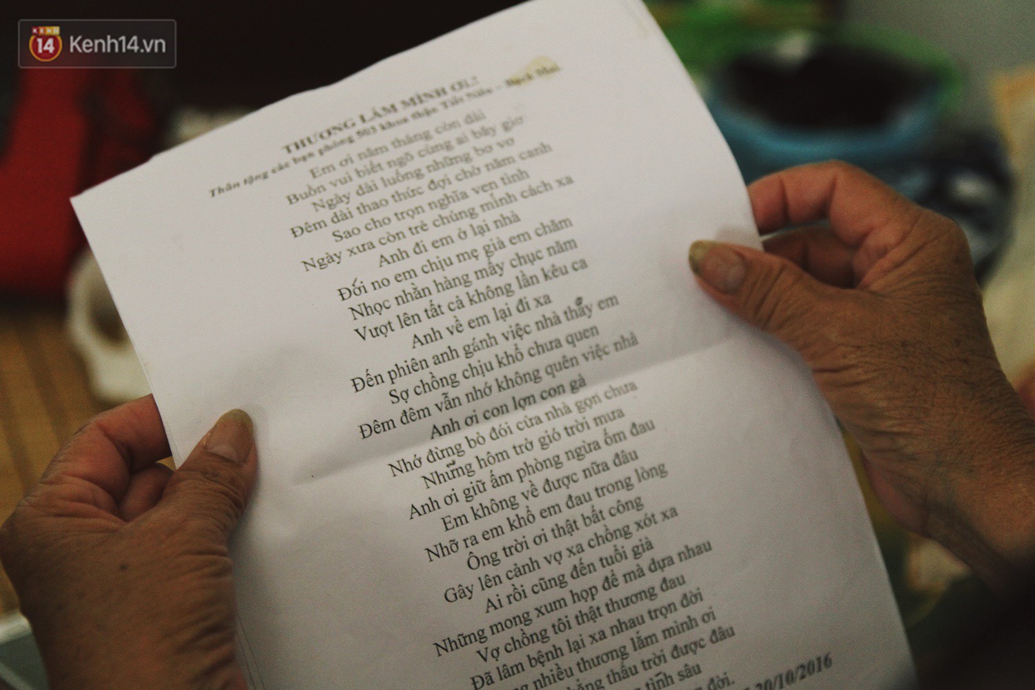 Ngày bà Tảo chuẩn bị bước vào phòng mổ cắt bỏ một quả thận, trong căn phòng trọ 10m2 của vợ, ông Nhan biên bài thơ "Thương lắm mình ơi!". Không chỉ là món quà động lực gửi đến vợ, ông còn thân tặng các bệnh nhân khác trong phòng 503 Khoa Thận tiết niệu - Bệnh viện Bạch Mai.