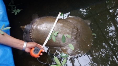 Theo GS Huỳnh, rùa mai mềm có thân hình to lớn, mai trơn và màu xám xanh.