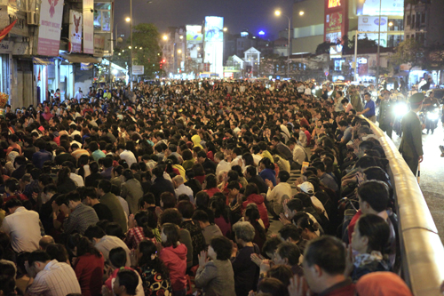 Hàng nghìn người dân ngồi chen chúc nhau dưới lòng đường trên đường Tây Sơn trước Tổ đình Phúc Khánh (Ảnh Dân Việt).
