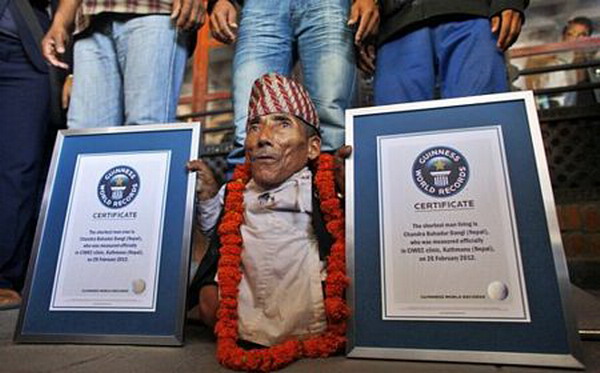 Còn Ông Chandra, người Nepal là người đàn ông thấp nhất thế giới từng được ghi nhận. Ông sở hữu chiều cao chỉ 54,6cm. Người đàn ông sống tại ngôi làng Reemkholi xa xôi, cách thành phố Kathmandu 540km về phía Tây Nam này đã đánh bại ngôi vị quán quân của một người sống tại New Delhi, Ấn độ. Được biết, người sở hữu danh hiệu cũ có chiều cao 57cm và đã qua đời năm 1997.