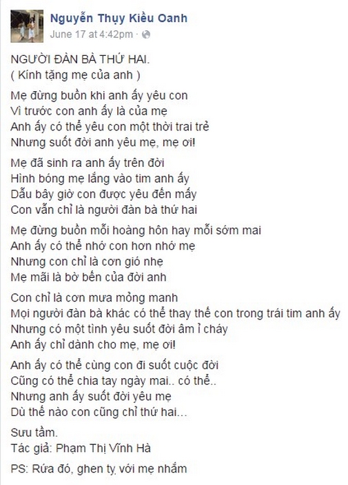 | Trước đó, trên trang cá nhân của vợ diễn viên Duy Nhân cách đây không lâu đã đăng một bài thơ vô cùng xúc động để tặng mẹ chồng. |