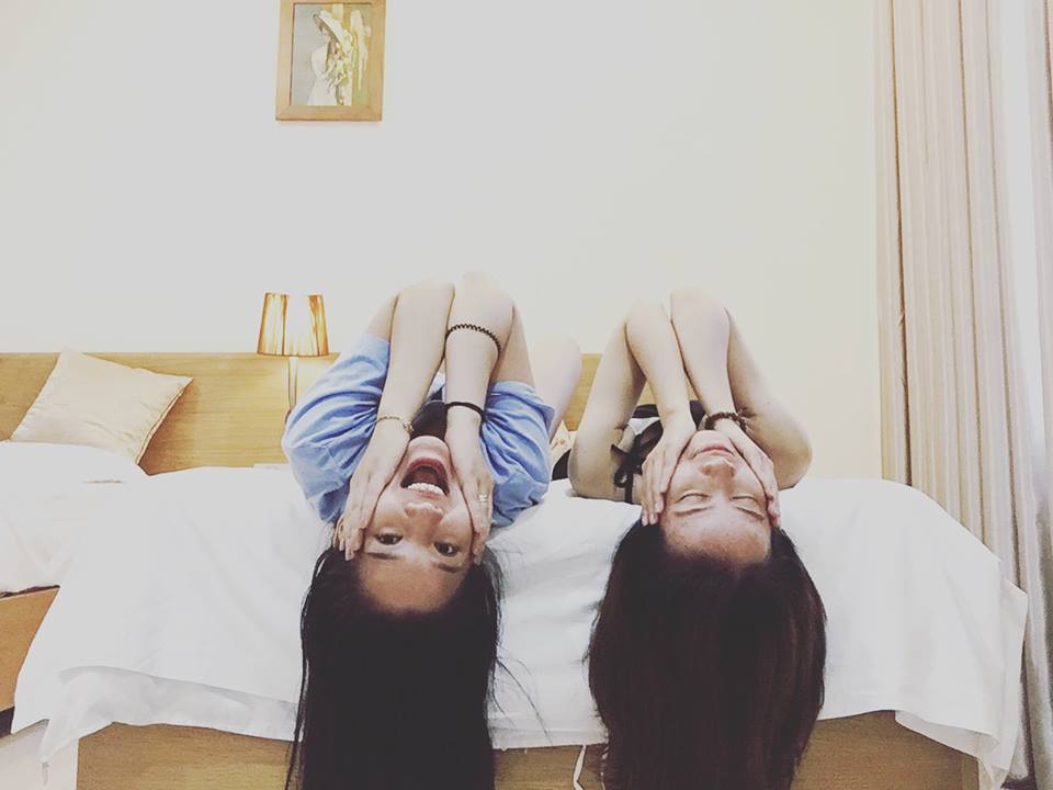 Cô nàng vui vẻ chia sẻ khoảnh khắc bên bạn thân. |