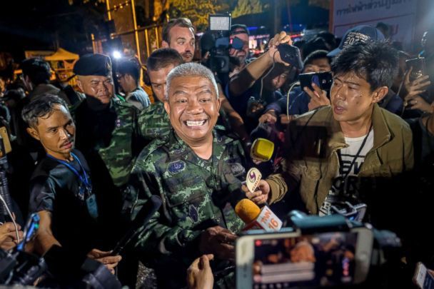 Tướng Bancha Duriyaphan tươi cười khi thông báo toàn bộ 13 người bị mắc kẹt đều sống sót sau hơn 9 ngày mắc kẹt. Ảnh: Getty |