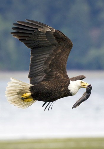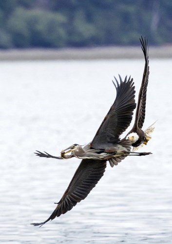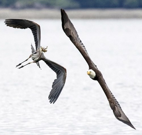 Khi thấy chim diệc xanh đang chuẩn bị thưởng thức con cá, đại bàng hói đã sải cánh dài dài và rộng, bay nhanh đến tập kích chỗ chim diệc xanh nhằm mục đích cướp mồi.