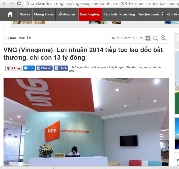 Tin tức trên Cafef/Trí thức trẻ cho biết, CTCP VNG (trước đây là Vinagame) vừa tiến hành phiên họp Đại hội cổ đông thường niên năm 2015. Trong số những nội dung trình Đại hội, thông tin đáng chú ý nhất là lợi nhuận năm 2014 của riêng công ty mẹ VNG tiếp tục giảm bất thường khi chỉ đạt vỏn vẹn 13 tỷ đồng, giảm 93% so với mức 186 tỷ đồng của năm 2013.