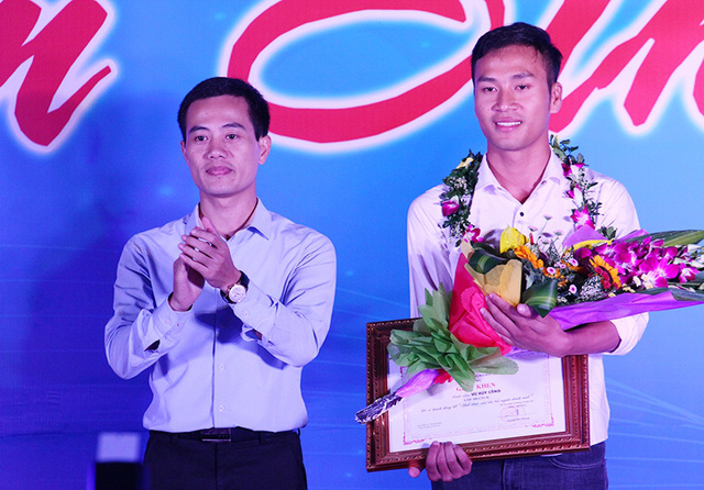 | Em Vũ Huy Cảng (bìa trái) được Hiệu trưởng Đại học Điện lực Trương Huy Hoàng tặng thưởng vào tối ngày 25.10. Ảnh: Lao Động |