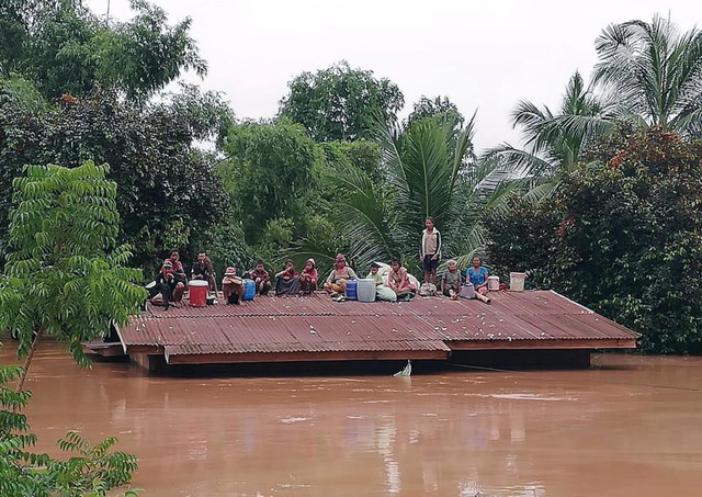 Người dân đứng trên mái nhà sau khi nước nhấn chìm nhiều làng mạc sau sự cố vỡ đập (Ảnh: ABC Laos) |