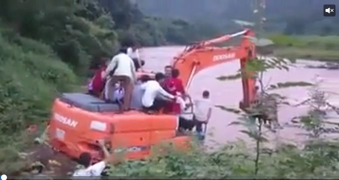 Cây cầu bị ngập, nên chú rể buộc phải sử dụng máy xúc để rước dâu qua con sông chảy xiết vì nước lũ.