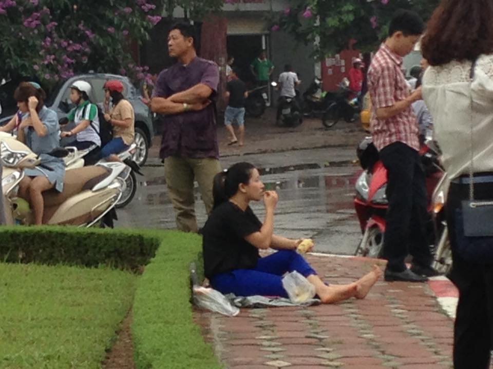 | Một người phụ nữ ngồi lên vỉa hè tranh thủ ăn sáng. Ảnh: Hồng Hạnh |