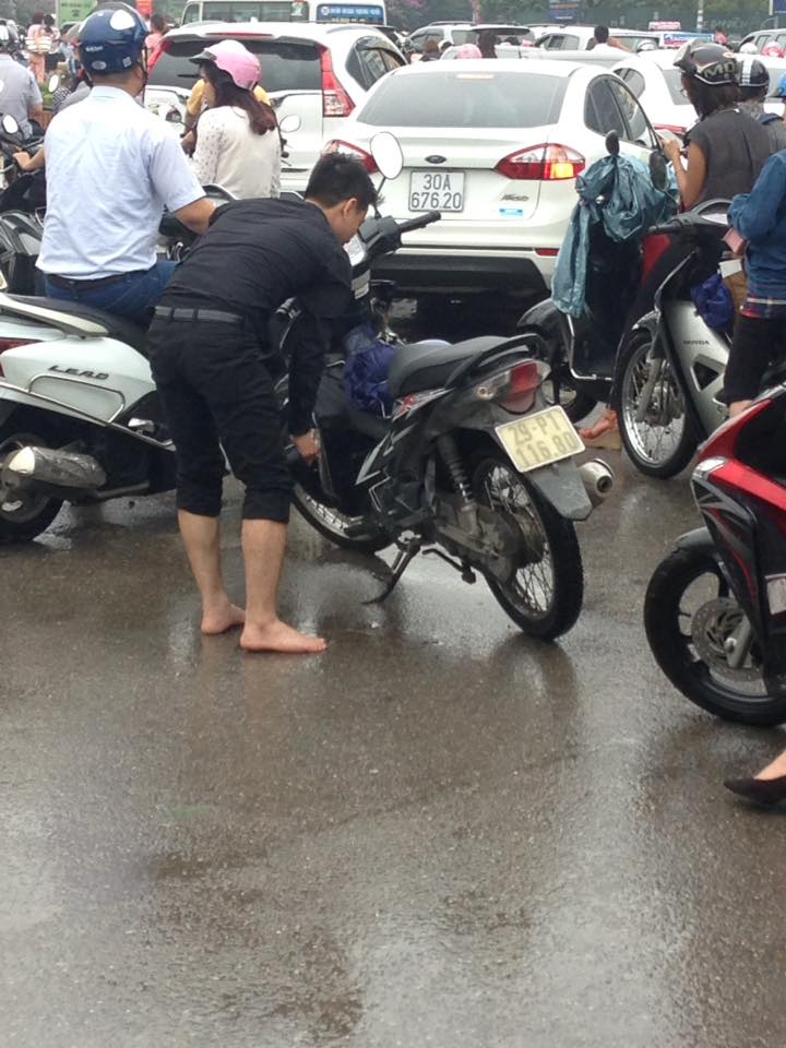| Nam thanh niên phải tháo giầy ra do nước ngập quá sâu. Ảnh: Hồng Hạnh |