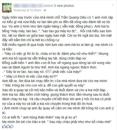 Theo người chứng kiến và chia sẻ trên câu chuyện trên Facebook, khi xảy ra sự việc, trong số bao nhiêu người qua đường không ai có động thái ngăn cản để giúp đỡ người vợ. Chỉ đến khi có một người đàn ông đang đèo con đi học về thấy sự bất bình nên đã dừng lại để ngăn người chồng bạo lực lại.