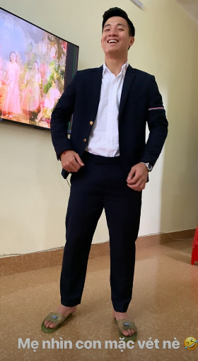 Trong khi ngày mùng 1 Tt, trung vệ Bùi Tiến Dũng nuột nà từ đầu đến tóc đều được chải chuốt cẩn thận, vest lịch lãm, đồng hồ đeo tay đắt tiền. Tuy vậy, đôi dép lê mới là điểm nhấn trong bức ảnh của chàng trung vệ này. Các phối đồ độc lạ khiến cả người đăng ảnh và người xem ảnh đều cười sảng khoái vui vẻ ngay ngày đầu năm mới.
