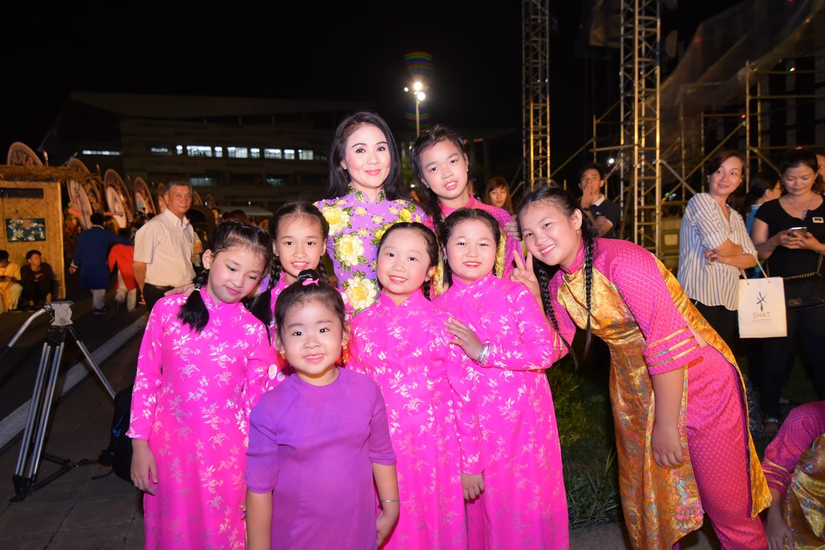 | NSƯT Thanh Ngân nổi bật với tà áo dài tím họa tiết hoa cùng chụp ảnh cùng người hâm mộ |