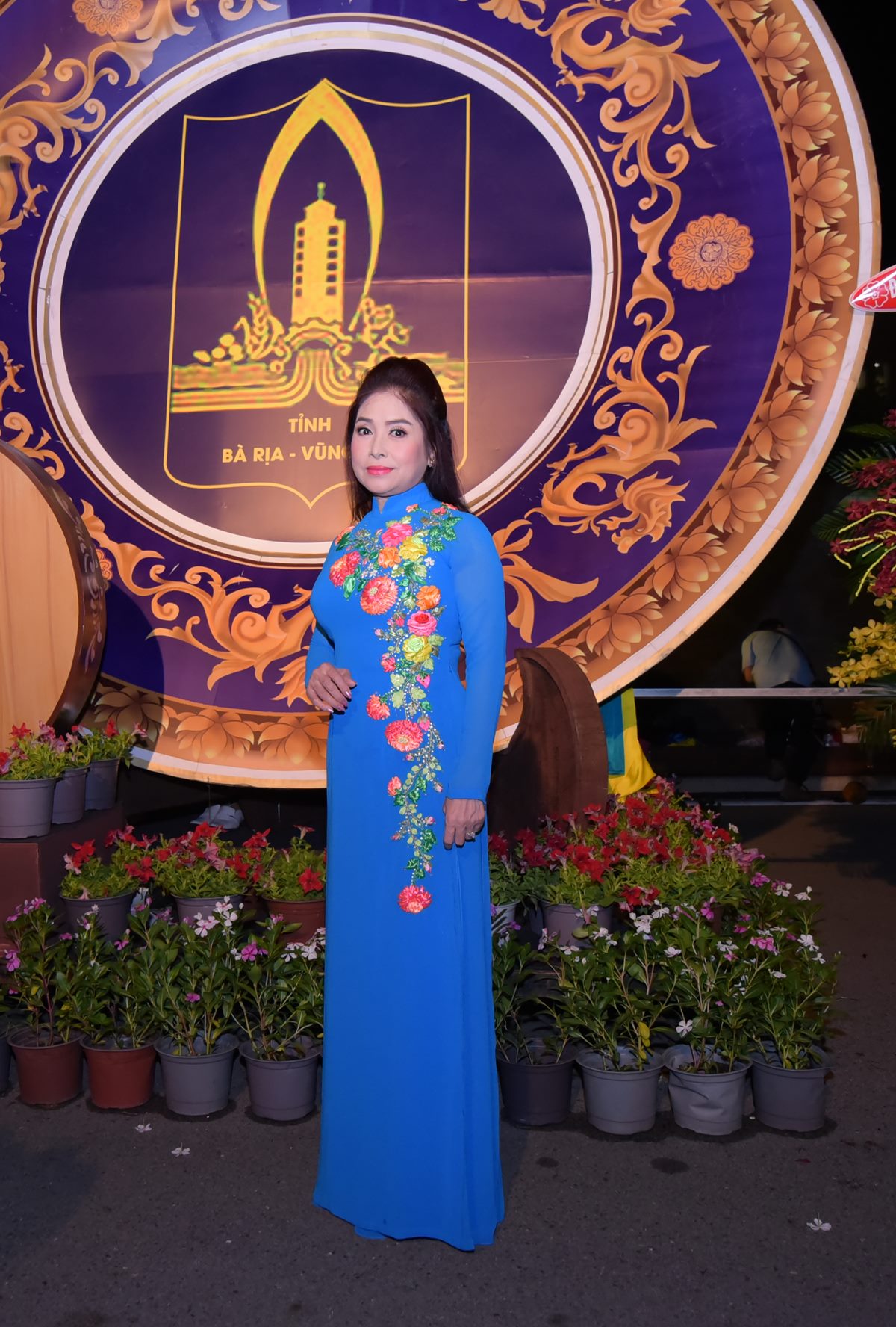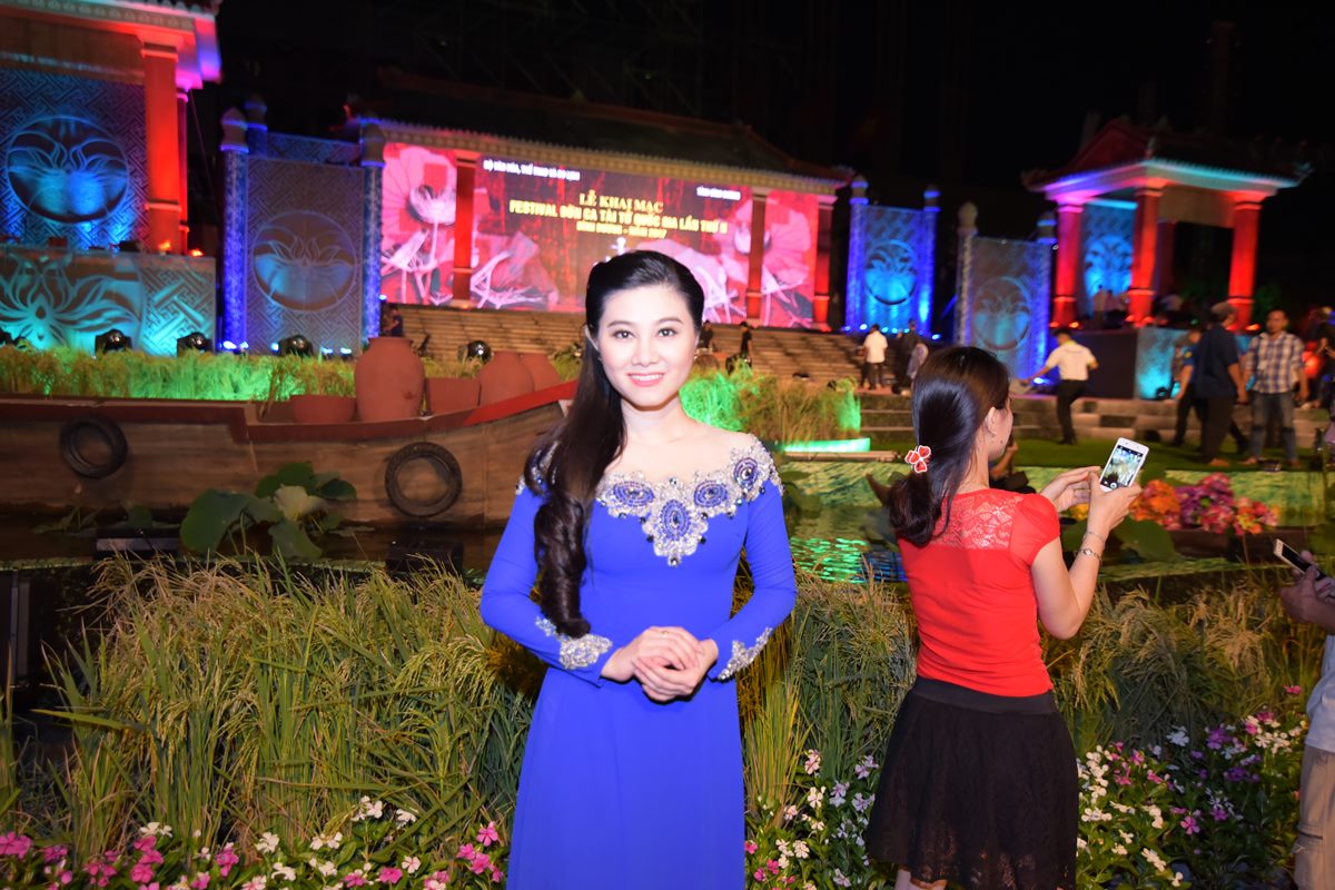| NSƯTQuế Trân duyên dáng trong áo dài cổ thuyền họa tiết thêu hoa. Trong khai mạc Festival Đờn ca tài tử, cô vừa tham gia biểu diễn vừa dẫn chương trình cùng diễn viên Quý Bình |