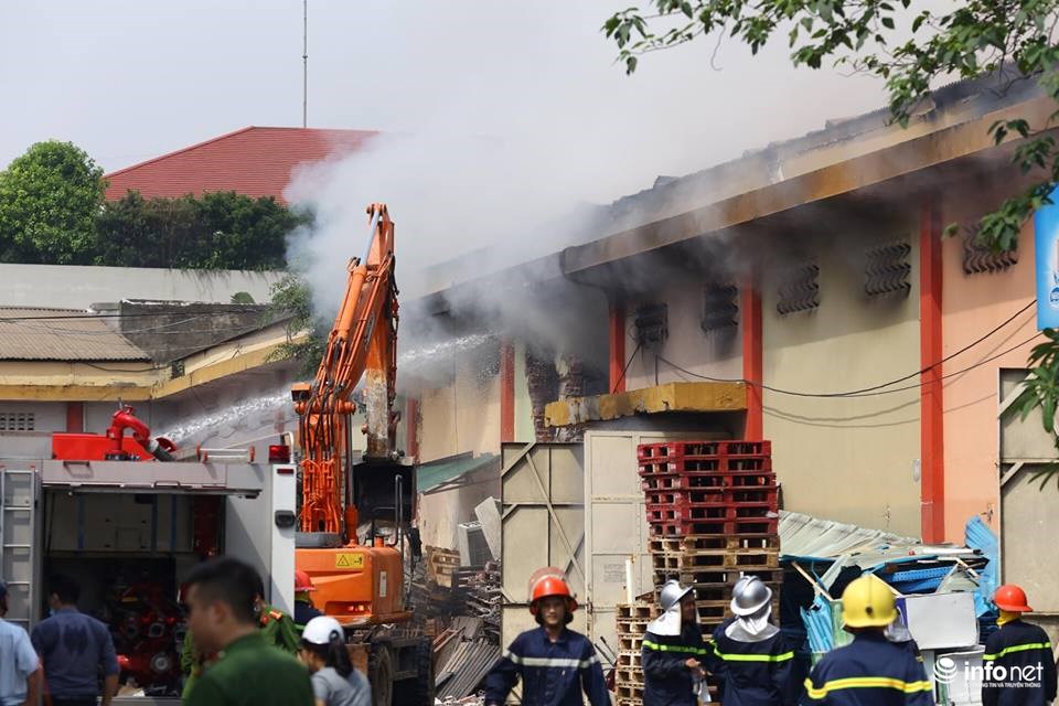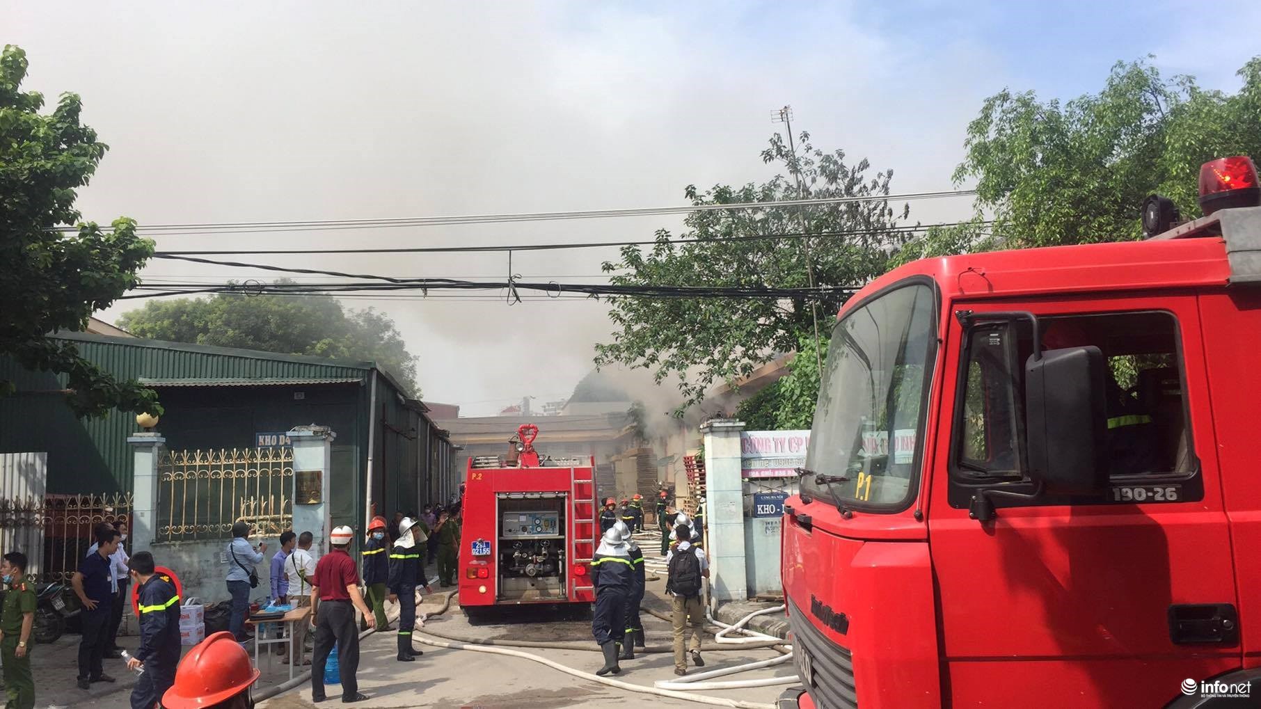 Đến khoảng 9h47 phút, lực lượng PCCC đang lấy nước từ sông Hồng lên, công nhân các kho bên cạnh vẫn đang khẩn trương di chuyển đồ ra khỏi vùng nguy hiểm.