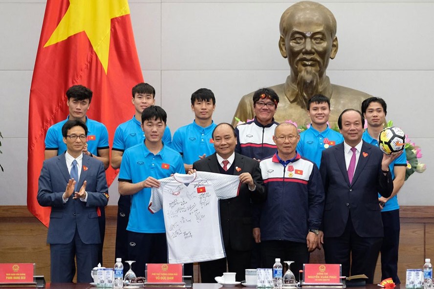 | Thay mặt đội tuyển, HLV Park Hang-seo trao tặng Thủ tướng quả bóng vàng và chiếc áo có chữ kí của đội tuyển. Ảnh: Cổng thông tin điện tử Chính phủ |