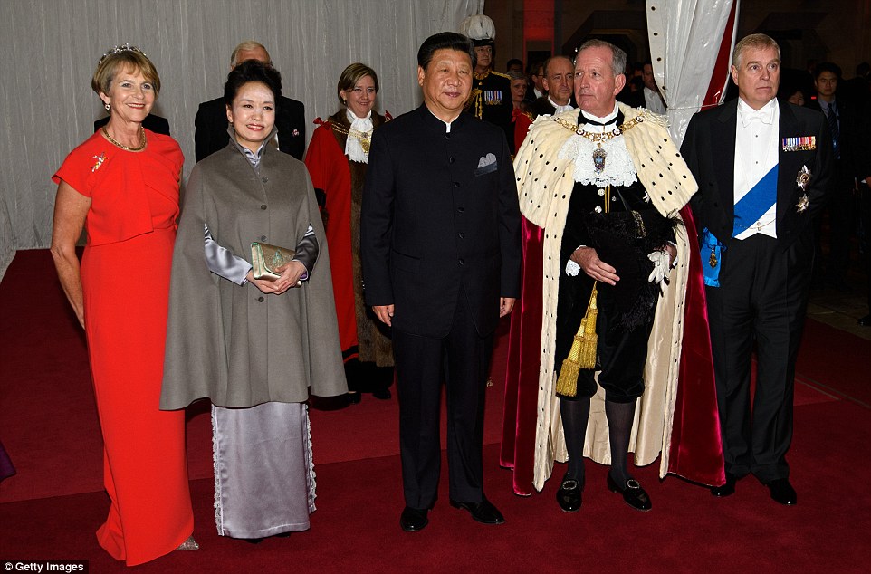 Vợ chồng Chủ tịch Trung Quốc Tập Cận Bình tham dự tiệc chiêu đãi của Thị trưởng London ở tòa thị chính. Ảnh: Daily Mail/Getty. |