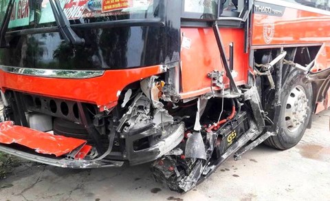 Vụ tai nạn đã khiến người phụ nữ bị thương nặng và được đưa đi cấp cứu. Chiếc xe khách bị hư hỏng nặng ở phần đầu.