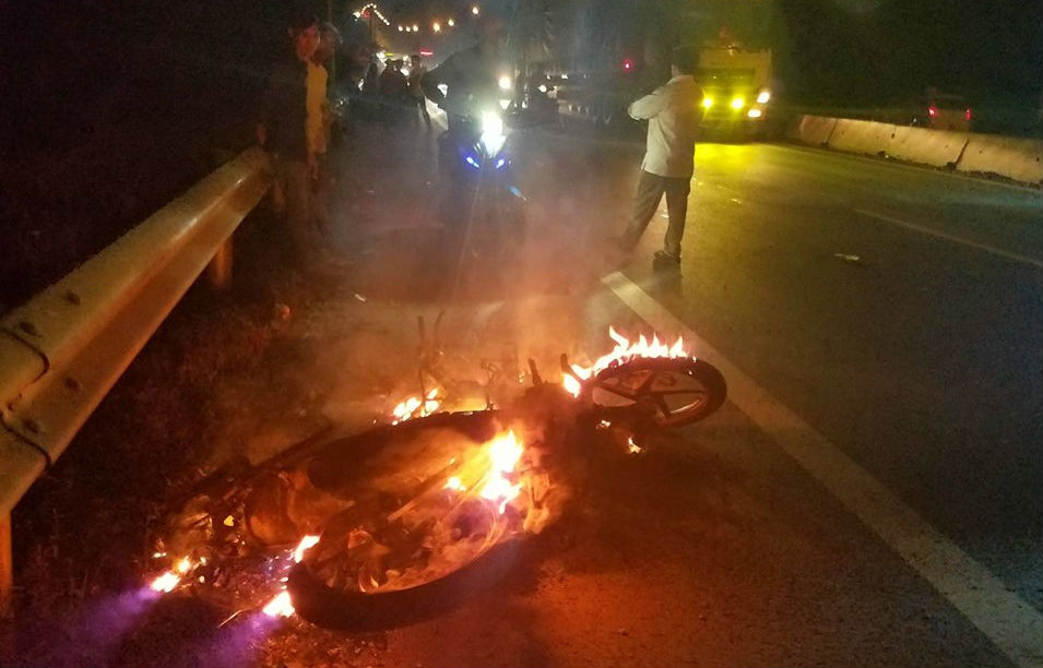 | Chiếc xe máy bốc cháy sau khi bị xe của một CSGT tông phải. Ảnh Vietnamnet |