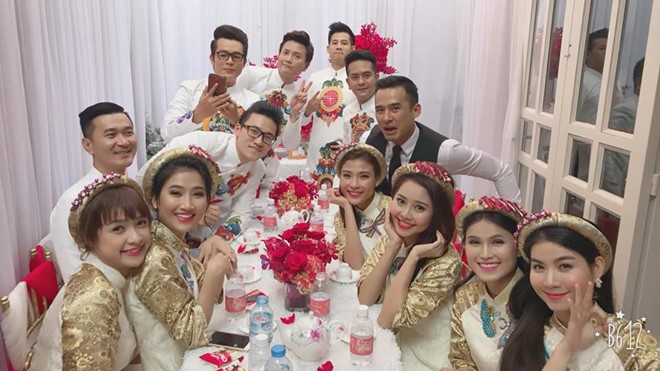 | Kha Ly, Thúy Diễm và dàn sao phim "Cổng mặt trời" được cô dâu nhờ làm phù dâu, phù rể trong hôn lễ. |