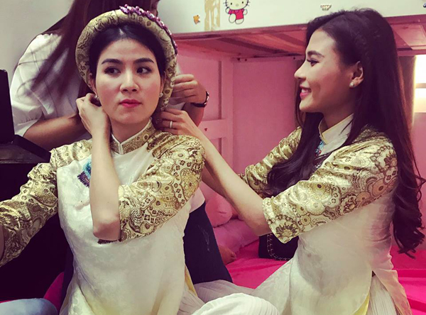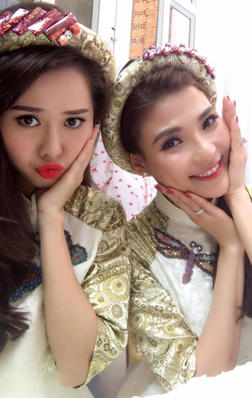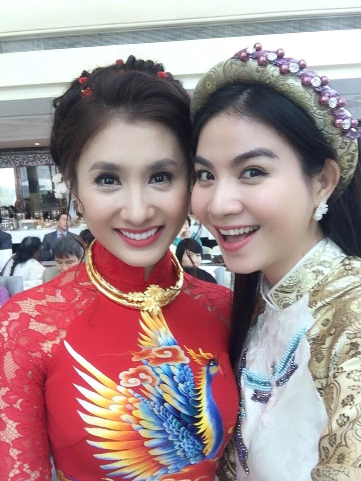 | Cô dâu Nguyệt Ánh trong trang phục áo dài đỏ, tóc kết đơn giản bên nữ diễn viên Kha Ly. "Cổng mặt trời thêm một thành viên lên xe bông. Chúc hạnh phúc nha cưng", bà xã Thanh Duy viết. |