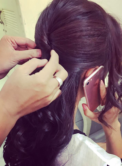 | Sáng 7/3, cô dậy sớm để chuyên gia trang điểm chăm chút gương mặt, mái tóc trong ngày trọng đại. Nữ diễn viên yêu cầu tất cả bạn bè không tiết lộ hình ảnh của mình trong hôn lễ. |