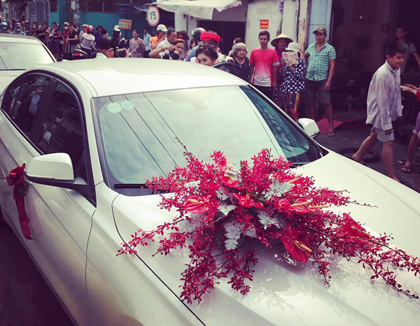 | Chú rể Ấn Độ mang xe hoa màu trắng, kết hoa đỏ tới rước nữ diễn viên về dinh. |