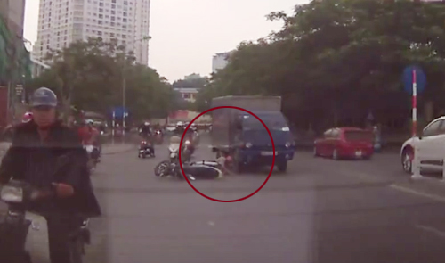 Người đàn ông chạy xe máy bất ngờ mất lái, lao ra giữa đường và bị xe tải từ phía sau vượt lên quệt vào tay lái ngã xuống đất, nằm ngay dưới bánh xe. Rất may, chiếc xe tải kịp thời đánh lái và dừng xe đúng lúc.