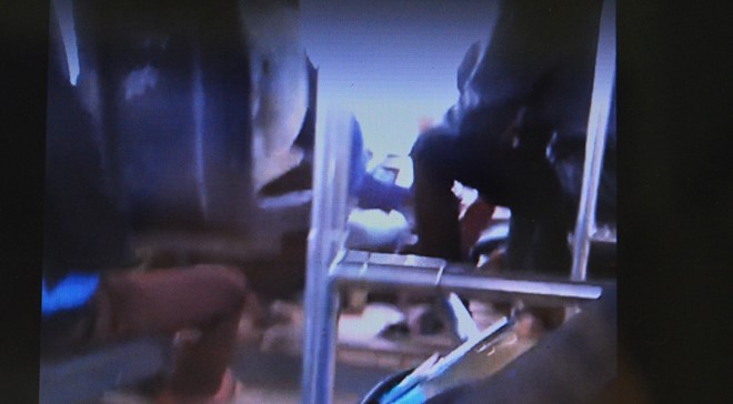 | Tài xế xe bus đưa tay lấy bài từ người ngồi kế bên. Ảnh cắt từ clip. |