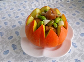 Bước 4: Bạn cho tất cả các nguyên liệu vừa trộn (bước 3) vào trong bí đỏ, thêm gừng và tỏi vào cùng. Cho bí đỏ vào nồi và hấp chín.
