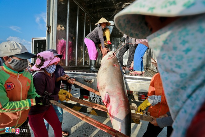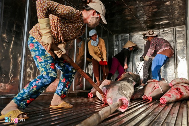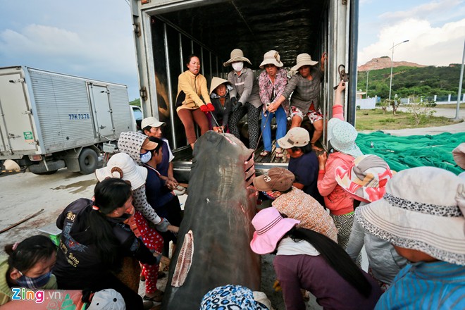 So với công việc khiêng cá trên bờ, đội kéo cá lên xe tải đông lạnh thường vất vả hơn, tiền công vì thế cũng được bồi dưỡng hơn từ 10.000 – 20.000 đồng mỗi người.