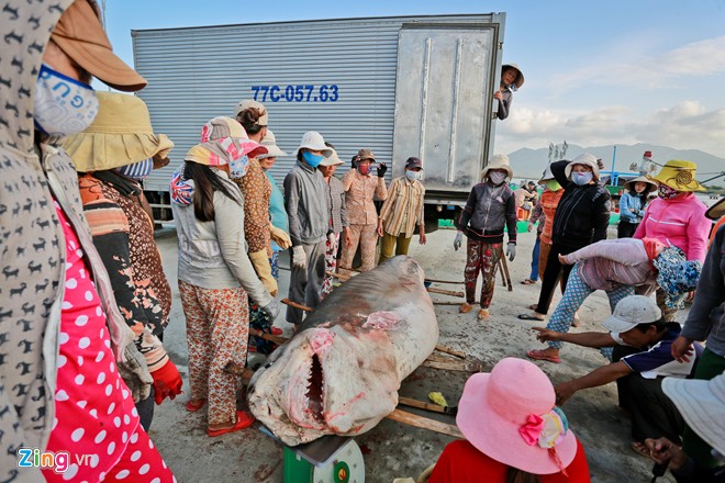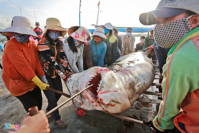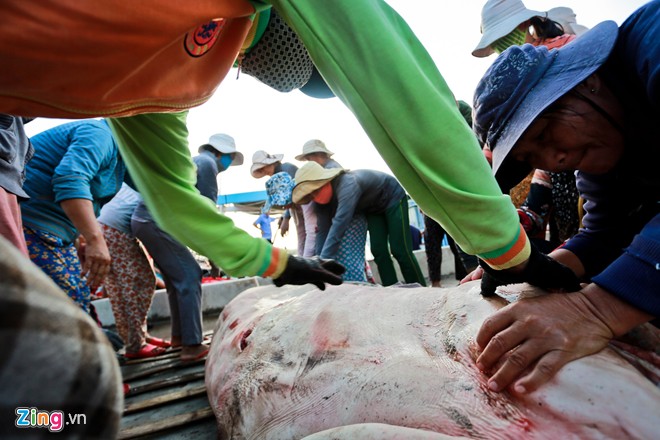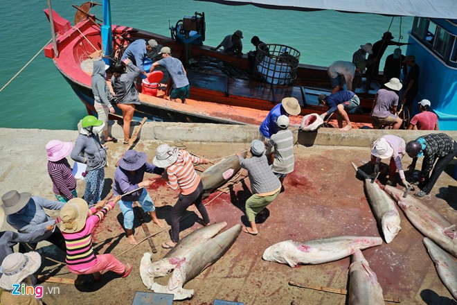 Hàng ngày, những phụ nữ này ở bến cá chờ tàu về. Tàu câu cá mập thường đi lâu ngày ở các vùng biển xa như Hoàng Sa, Trường Sa sau đó mang về những con cá mập nặng hàng tạ.