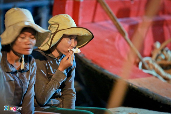 Bữa tối vội vàng của chị Huỳnh Thị Đứng để có sức tiếp tục công việc. Chị cho biết nhiều lúc tàu cập cảng muộn mọi người phải khiêng cá tới 22h đêm mới xong.