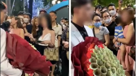 Tỏ tình gái xinh bằng một bó hoa tiền trên phố đi bộ, chàng trai nhận cái kết cực phũ