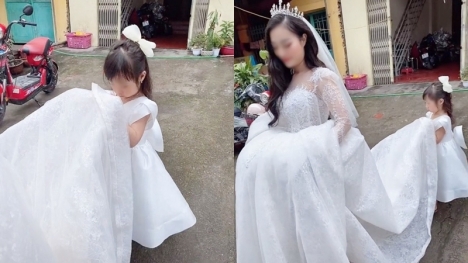Con gái nhỏ nâng váy, mặt rưng rưng khi tiễn mẹ ‘bước nữa’ về nhà chồng