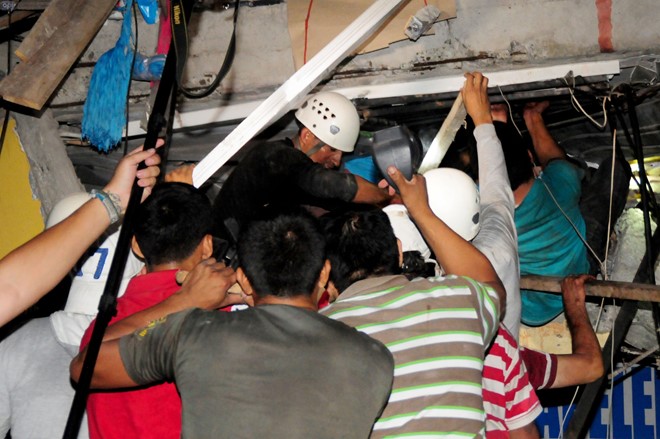 Nhân viên cứu hộ giải cứu người sống sót bị mắc kẹt trong một toà nhà đổ. Cơn địa chấn mạnh đã phá huỷ các toà nhà và khu dân cư, khiến người dân phải bỏ chạy và sơ tán đến nơi an toàn - Ảnh: Getty |