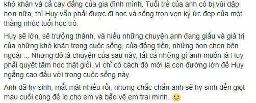 "Huy là động lực để anh kiên cường với tất cả những khó khăn và cả cay đắng của gia đình mình. Huy sẽ lớn, sẽ trưởng thành, và hiểu những chuyện anh đang giấu và giá trị của những khó khăn trong cuộc sống, của đồng tiền, những bon chen bên ngoài… Nhưng đó là chuyện của sau này, tất cả những gì anh muốn là Huy phải quyết tâm học thật giỏi, vì chỉ có cách đó mới là con đường lớn để Huy ngẩng cao đầu với trong cuộc sống này. Anh đã hy sinh, mất mát nhiều rồi, nhưng chắc chắn anh sẽ hy sinh đến giọt máu cuối cùng để lo cho em và bảo vệ em trai mình" – Đông Hùng chia sẻ.
