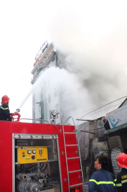 Nhận được tin báo, lực lượng cảnh sát PCCC với nhiều xe chữa cháy đã được điều tới, khẩn trương dập tắt đám cháy, đồng thời ngăn cháy lan sang quán karaoke.