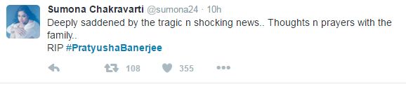 | Diễn viên Sumona Chakravarti đau xót: "Vô cùng đau buồn vì tin tức quá bi thương và sốc này. Tôi xin chia sẻ và cầu nguyện cùng gia đình cô ấy. Hãy yên nghỉ, Pratyusha" |