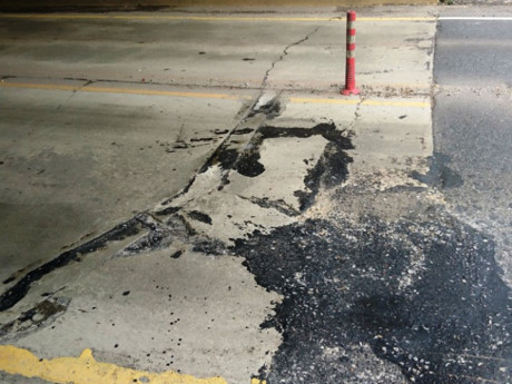 | Những chỗ bong tróc được ban quản lý dự án dùng nhựa đường vá lại một cách sơ sài |