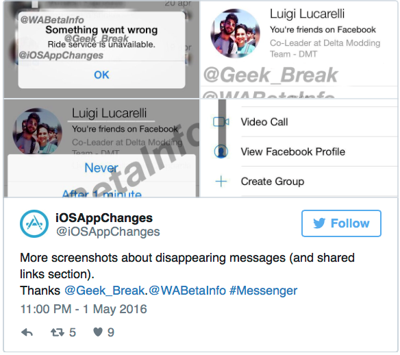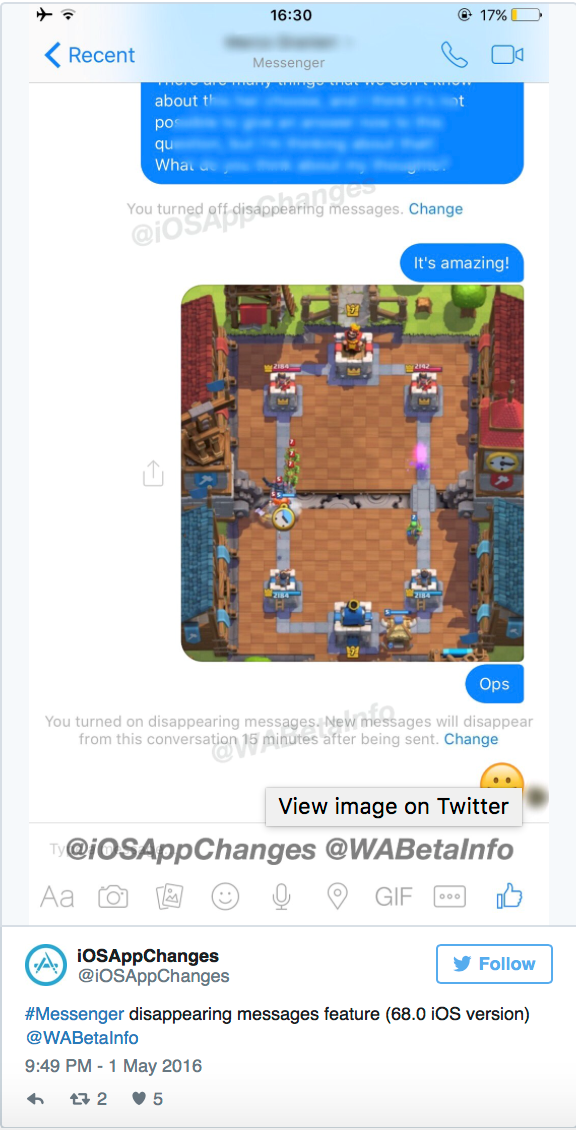 | Hình ảnh minh chứng về sự xuất hiện của tính năng tự hủy tin nhắn trên Messenger. Ảnh: Venturebeat. |