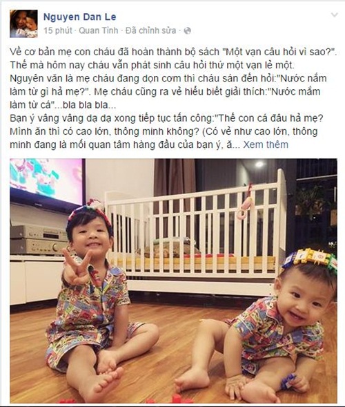 Đan Lê chia sẻ những câu hỏi ngộ nghĩnh của các con: "Về cơ bản mẹ con cháu đã hoàn thành bộ sách "Một vạn câu hỏi vì sao?". Thế mà hôm nay cháu vẫn phát sinh câu hỏi thứ một vạn lẻ một.