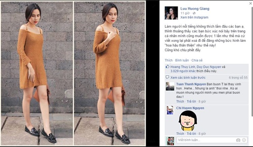 | Lưu Hương Giang chia sẻ cảm xúc khi làm người nổi tiếng: "Làm người nổi tiếng không thích lắm đâu các bạn ạ, thỉnh thoảng thấy các bạn bức xúc nói bậy trên trang cá nhân mình cũng muốn được 1 lần như thế mà cứ viết xong lại phải xoá đi để đăng những bức hình làm "hoa hậu thân thiện" như thế này! Cũng khó chịu phết đấy". Ảnh: FBNV |