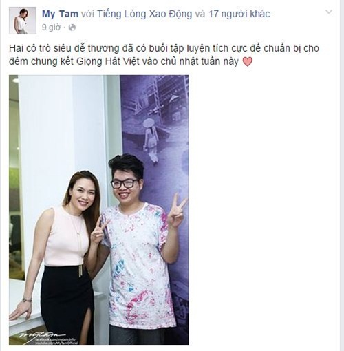 | Mỹ Tâm: "Hai cô trò siêu dễ thương đã có buổi tập luyện tích cực để chuẩn bị cho đêm chung kết Giọng Hát Việt vào chủ nhật tuần này." Ảnh: FBNV |