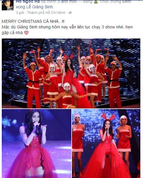 Hồ Ngọc Hà vẫn tích cực chạy Show trong ngày lễ giáng sinh. Dù vậy, nữ ca sĩ cũng không quên gửi lời chúc giáng sinh đến người hâm mộ.
