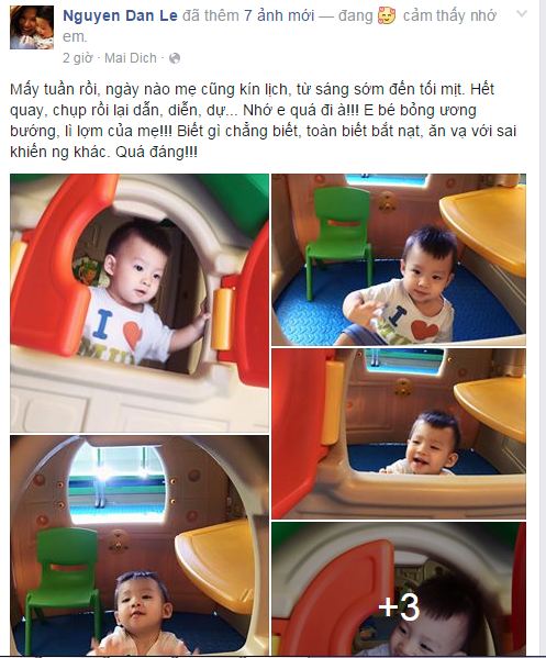 | Đan Lê: "Mấy tuần rồi, ngày nào mẹ cũng kín lịch, từ sáng sớm đến tối mịt. Hết quay, chụp rồi lại dẫn, diễn, dự... Nhớ e quá đi à!!! E bé bỏng ương bướng, lì lợm của mẹ!!! Biết gì chẳng biết, toàn biết bắt nạt, ăn vạ với sai khiến ng khác. Quá đáng!!!" Ảnh: FBNV |